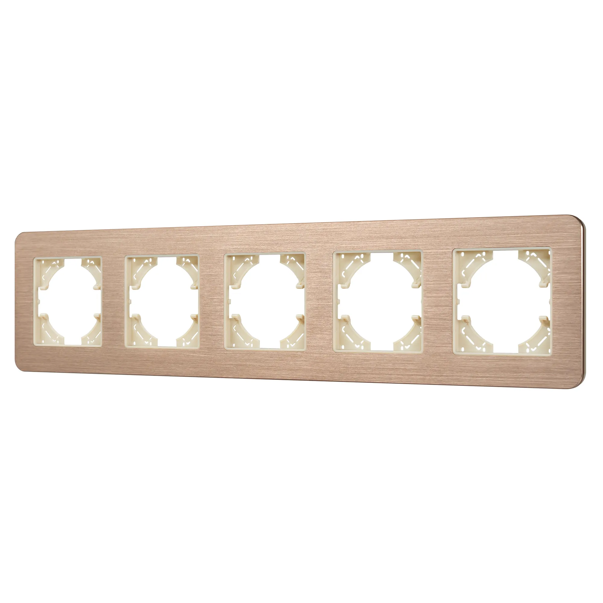 Рамка алюминиевая на 5 постов, под встраиваемый механизм. Цвет - золотой. Уровень герметичности IP20. Ориентация монтажа - горизонтальная (основным ориентиром служат посадочные выступы для накладки механизма).