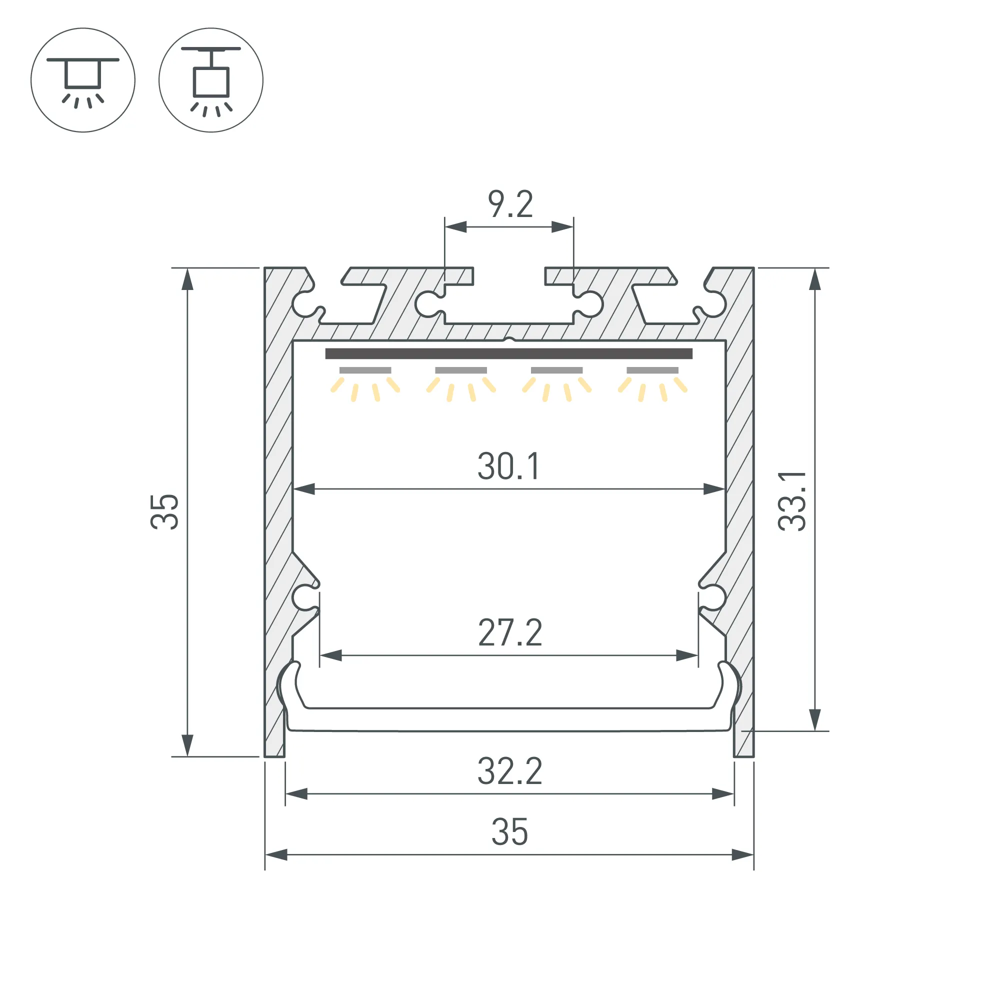 Алюминиевый профиль для светодиодных лент и линеек. Цвет - черный RAL9005 (порошковая окраска). Габаритные размеры (L×W×H): 2000x35x35 мм. Ширина площадки для ленты 30,1 мм. Экраны, заглушки и другие аксессуары приобретаются отдельно. Цена за 1 метр.